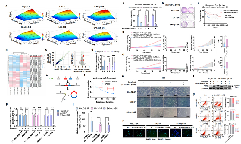 图2. circRNA-SORE在索拉非尼耐药的肝细胞肝癌中明显升高,并且在耐药的发生中发挥重要意义
