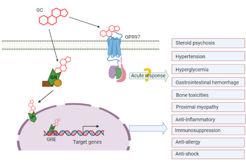 糖皮质激素是机体内极为重要的一类调节分子,它对机体的发育、生长、代谢以及免疫功能等起着重要的调节作用,是机体应激反应最重要的调节激素,同时也是临床上使用最为广泛而有效的抗炎和免疫抑制剂。早在1950年,美国的菲利普·肖瓦特·亨奇、爱德华·卡尔文·肯德尔和瑞士的塔德乌什·赖希施泰因便因为发现和应用糖皮质激素治疗风湿性疾病而获得了诺贝尔奖。前人大量的研究显示,糖皮质激素具有两种不同的作用模式。其中广为人知的是,糖皮质激素与其核受体结合,在细胞核内调控相关基因的表达而发挥作用,这种作用方式一般需要较长的反应时间,被称为基因组机制。除此之外,研究人员发现,糖皮质激素也能够通过快速反应的方式引起细胞和机体的变化。进一步的研究发现糖皮质激素可以与大脑突触的膜组分结合。这提示我们,糖皮质激素可能存在膜受体。随后的研究显示糖皮质激素的快速反应与G蛋白密切相关,Gi的抑制剂PTX能够抑制糖皮质激素的快速作用。因此,研究人员推测介导糖皮质激素的快速反应过程的膜受体可能是GPCR。然而,一直以来这个猜测未能确证,其快速作用的机制依然成谜。