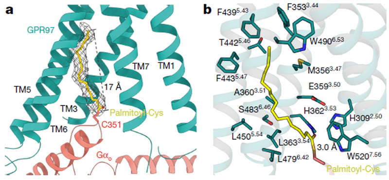 意外的是,分析冷冻电镜密度图发现在Gαo-α5螺旋的C351位点存在棕榈酰化修饰(如图2所示)。这是目前首次在GPCR-Gi/o复合物结构中发现此修饰。目前学术界普遍认为C351位点的翻译后修饰会导致Gi/o信号通路的功能丧失。而我们这里的功能研究表明,Gα C351位棕榈酰化修饰对黏附受体GPR97的G蛋白偶联及其下游信号转导起到促进作用,颠覆了目前的认知,是对Gi/o信号通路精细调控的重要补充。