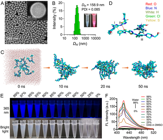 图2,达沙替尼自组装颗粒的表征和聚集诱导发光现象。A.自组装纳米颗粒的扫描电镜图。B.纳米溶液的粒径分布和丁达尔现象。C,D.利用分子动力学模拟探究自组装体的形成和分子间相互作用力。E,F.自组装药物的聚集诱导发光现象。
