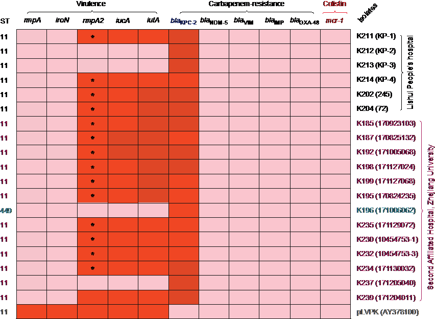 碳青霉烯类抗生素是临床上抵御多重耐药菌感染的常用药物。碳青霉烯耐药的肺炎克雷伯氏菌(CRKP)的凸现与流行,给细菌感染的临床以及公共卫生构成了严重威胁。近年来,高毒力CRKP的ST11克隆在院内感染中被检出。鉴于其同时具备高毒力和耐药性这两种特性,因此引起了较大关注和学术讨论。为进一步探明该ST11克隆在临床上的定植与分布情况,浙医二院的综合ICU双聘教授冯友军课题组与综合ICU黄曼主任研究团队联合攻关,开展了较为系统的比较功能基因组学的研究。该研究采集和分析了23例来自两家不同公立三甲医院的患者标本(浙医二院和丽水市人民医院),对标本菌株的耐药性和毒力进行了系统筛查,探究了耐药质粒与和毒力质粒在ST11克隆群共存的特征 (图1)。