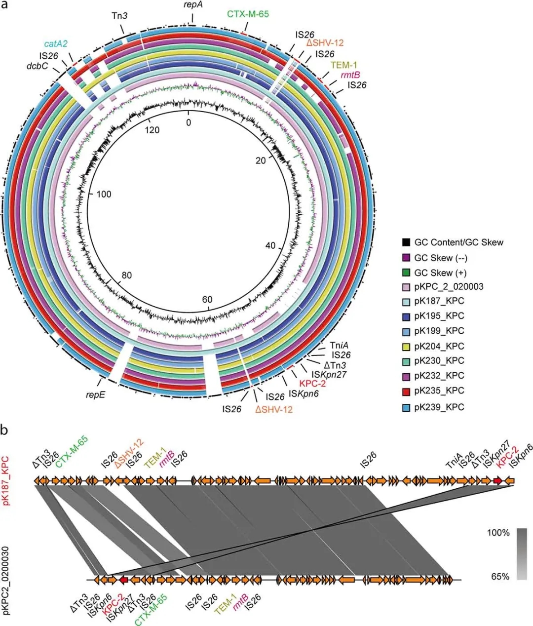 通过基因组学深度测序,该研究获得了21条Hv-CRKP耐药/独立相关的质粒全长序列。13条为rmpA2阳性毒力质粒,另8条为blaKPC-2耐药质粒。质粒去除试验和动物感染模型试验结果表明,高毒力表型是多种毒力因子共同作用的结果,而不是由单一的毒力质粒决定的。该研究发现:毒力质粒中携带的毒力基因rmpA2由于缺少移码突变导致其功能丢失。因此,rmpA2基因并非细菌“拉丝”特征的决定因素。此外,细菌的“拉丝”特性也并非细菌毒力的唯一决定因素,高毒力的产生是多种毒力相关因子共同作用的结果。显然,仅凭“是否拉丝”或者“是否携带毒力基因”作为“高毒力肺克”的判断是值得商榷的。进一步的功能基因组学分析亦有以下2个重要发现:(1) 除ST11外,亦发现一种新型ST449克隆群;(2)不同于以往170kb大小的KPC-2耐药质粒, 当前流行株携带~120kb的IncFII-IncR型质粒 (图2)。上述发现丰富了我们对Hv-CRKP耐药的认知。