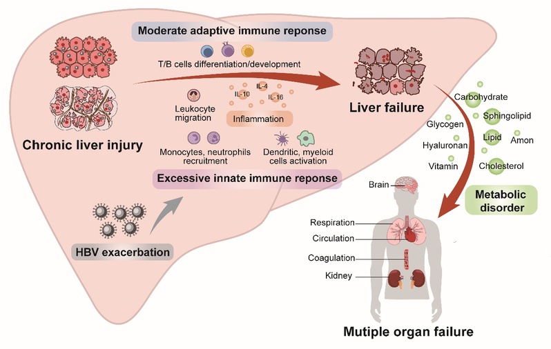 慢加急性肝衰竭(ACLF)是一种在慢性肝病基础上出现的急性肝功能恶化,伴随肝脏和肝外器官衰竭的高病死率复杂综合征,内科综合治疗的短期病死率高达50-90%,其关键原因是发病机制不清。欧洲肝衰竭研究联盟(EF-CLIF)研究发现系统性炎症反应是酒精肝、丙肝等人群ACLF发病的关键机制,但我国乙肝人群ACLF(HBV-ACLF)的发病机制至今没有系统阐明。