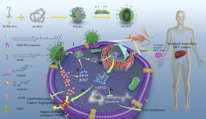 索拉非尼,作为进展期肝癌治疗的一线药物,能够有效提高肝癌细胞内活性氧(ROS)的浓度。利用这一特点,研究团队将索拉非尼及基因药物shUSP22共同包裹进ROS响应性聚合物B-PDEAEA中得到Gal-SLP。据研究人员介绍,该种自激活纳米药物在肝癌细胞内能够起到三重协同抗癌效应。首先,索拉非尼能够引起细胞内ROS水平的上升,引发聚合物团聚体(Polyplex)的崩解,促使更多基因药物(shUSP22)进入细胞核,高效抑制细胞内USP22蛋白的表达。其次,USP22表达下降可进一步降低多药耐药相关蛋白-1(MRP-1)的表达,从而抑制索拉非尼向细胞外转运,造成肿瘤内索拉非尼的积聚,并进一步引发细胞内ROS水平的升高。同时,USP22表达的下降能够有效抑制肝癌细胞糖酵解的水平,从而干预肿瘤细胞代谢。