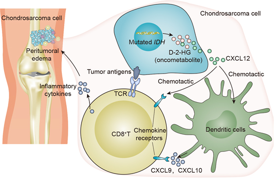 研究团队通过近3年时间收集98例新鲜的普通型软骨肉瘤手术切除标本,利用多色流式细胞术定量分析其免疫细胞组成,并在其中的22例进行完整的质谱流式(CyTOF)分析,绘制了普通型软骨肉瘤的免疫细胞图谱,发现普通型软骨肉瘤是一种富含CD68hi CD11c+树突状细胞的肿瘤,且可以分为3种免疫亚型,分别为高度免疫抑制的“G-MDSC优势型”、富含树突状细胞和T细胞的“免疫衰竭型”、及免疫细胞浸润极少的“免疫沙漠型”。随后研究团队使用包括全外显子测序、影像学资料和病理资料在内的多组学手段,发现IDH1/2突变、磁共振T2相的瘤周水肿、病理高级别是普通型软骨肉瘤中存在免疫反应的生物标记,同时符合以上三个条件的肿瘤对应“免疫衰竭”亚型。