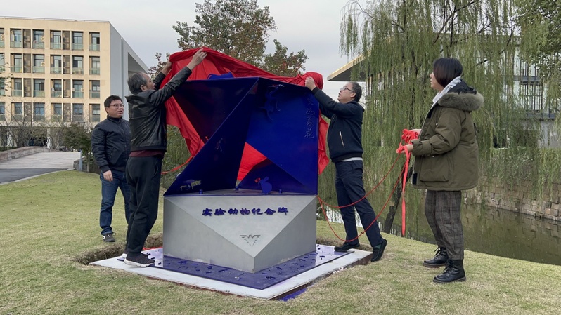 仪式由中心傅军老师主持,他首先向全体到场员工介绍了实验动物对于生命科学和医学研究的重要作用。随后介绍了这座新的实验动物纪念碑的设计理念,它的创作灵感来自于莫比乌斯环,象征的永恒、无限,寓意着对实验动物的感激。雕塑上有鼠、兔,鱼、犬、鸟和猴等实验动物形象,由傅军和宋见惠等老师为纪念碑揭幕。