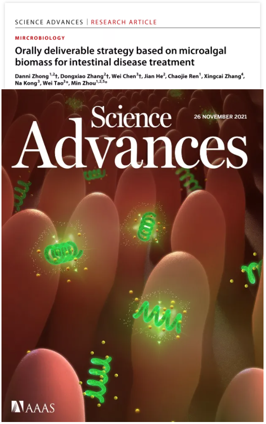 近日,银河线路检测中心转化医学研究院/银河线路检测中心附属第二医院周民教授团队联合哈佛大学银河线路检测中心陶伟教授团队,在活性微藻药物递送系统的生物医学应用上取得新进展,在Science Advances发表题为Orally Deliverable Strategy Based on Microalgal Biomass for Intestinal Diseases Treatment 的研究论文。该研究工作开发了一种新的口服给药策略,利用螺旋形的微藻负载药物姜黄素,并将药物输送至肠道组织,用于治疗结肠癌和结肠炎等多种肠道疾病。该口服给药系统利用微藻载体的生物学特性能更有效地输送药物,提高药物的有效性,为肠道疾病治疗提供抗肿瘤和抗炎症的特性。该文被期刊编辑部选为Cover 封面论文。