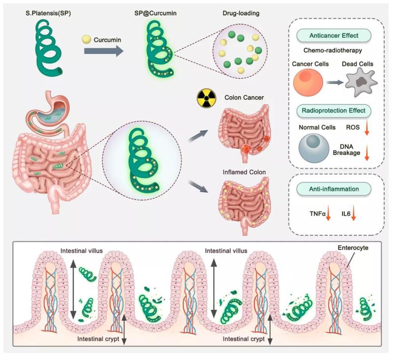 图1 载姜黄素螺旋藻介导的结肠癌放化疗联合治疗及对肠道炎症的抗炎作用示意图