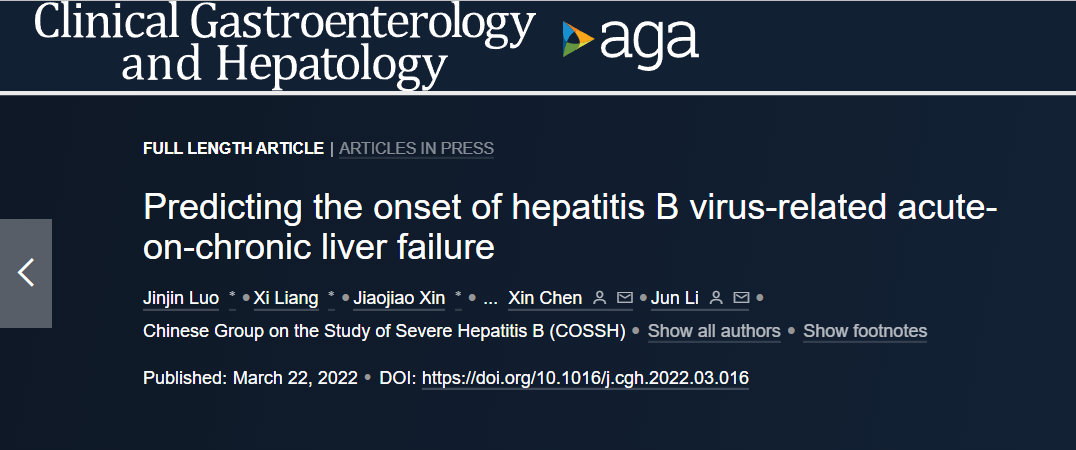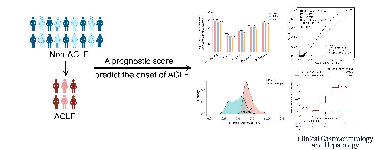 近日,课题组在前期基础上,进一步利用COSSH开放研究大队列,发现总胆红素(TB)、国际标准化比值(INR)、丙氨酸转氨酶(ALT)、铁蛋白(SF)是预测7天内ACLF发生的最佳指标,并以此构建了预测ACLF发生的评分模型COSSH-onset-ACLFs(=0.101×ln(ALT)+0.819×ln(TB)+2.820×ln(INR)+0.016×ln(ferritin))。基于4个简单临床指标的新评分模型,可准确预测7/14/28天ACLF的发生,为早期精准识别ACLF高危患者,指导临床早期救治,阻止ACLF发生,显著提升我国肝衰竭早诊预警的临床管理与决策能力。研究结果于2022年3月22日以“Predicting the onset of hepatitis B virus-related acute-on-chronic liver failure”为题在线发表在胃肠肝病学杂志Clinical Gastroenterology and Hepatology上。