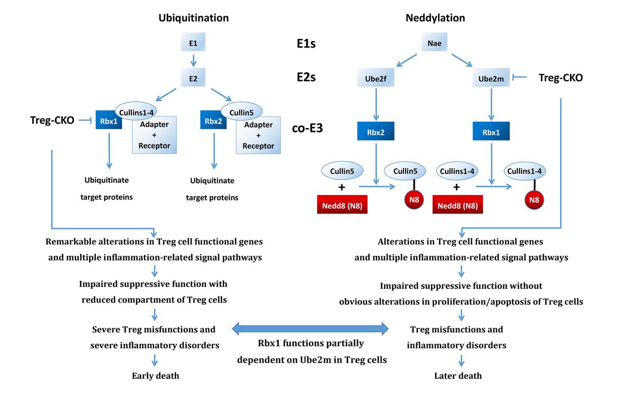 蛋白质拟素化是一种类泛素化修饰,由类似于泛素化的E1-E2-E3酶促级联反应催化完成;拟素化修饰对于CRLs的活性非常重要,其中拟素化E2耦联酶Ube2m是Rbx1的上游,拟素化E2耦联酶Ube2f是Sag的上游8。在Treg细胞中敲除Ube2f,小鼠没有明显的炎症反应,和敲除Sag相似。令人惊奇的是,在Treg细胞中敲除Ube2m,引发的表型要远远弱于Rbx1缺失引发的,表明在Treg细胞中,Rbx1的功能只是部分依赖于Ube2m,与经典观点不同,暗示了Ube2m-Rbx1调控的复杂性。