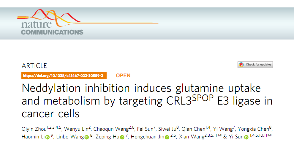 2022年5月31日,银河线路检测中心附属第二医院肿瘤研究所/银河线路检测中心转化医学研究院孙毅教授团队在Nature Communications 发表题为Neddylation inhibition induces glutamine uptake and metabolism by targeting CRL3SPOP E3 ligase in cancer cells的研究论文。报道了拟素化修饰通过CRL3SPOP E3泛素连接酶调控肿瘤细胞的谷氨酰胺吸收和代谢。