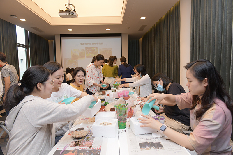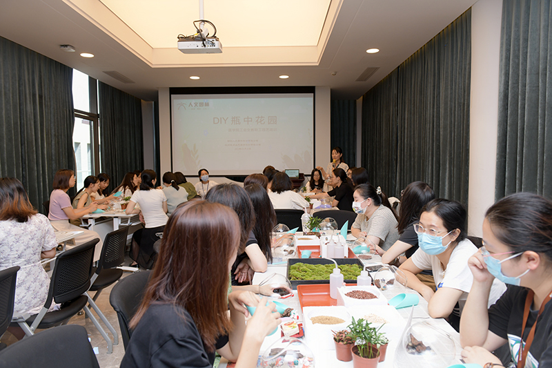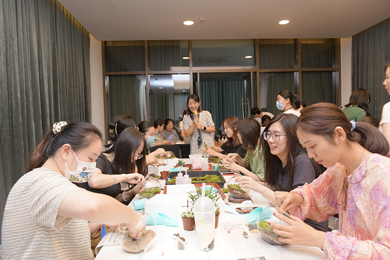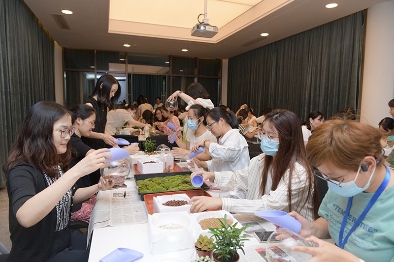 在袁老师的讲解和带领下,女教职工全情投入,大家用心制作着属于自己的盆景小花园。经过一番精心搭配,普通的绿植摇身一变,成为一件件独具匠心与魅力的艺术品。活动现场欢声笑语,其乐融融。