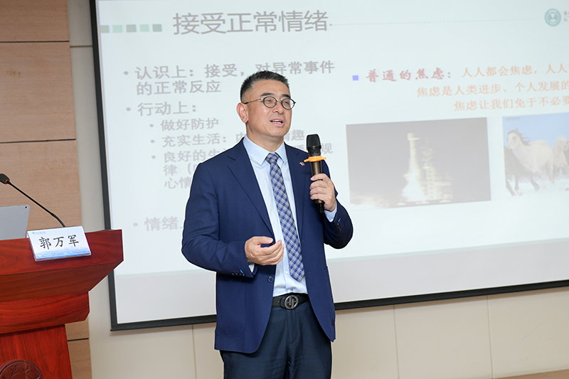 郭万军以“掌控情绪 优雅人生”为题,从“应激理论”、“接受正常情绪”、“调控不良情绪”、“治疗病态情绪”、“身体器官也会闹情绪”五个方面展开,用生动鲜活的案例和幽默风趣的语言,结合教职工工作实际,对不同类型情绪及表现的认识、压力来源、如何解压等内容进行讲解,同时与在场教职工进行了积极互动。