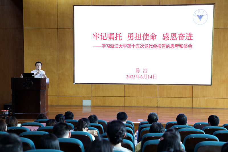校保密办主任兼党办、校办副主任陈浩作《牢记嘱托 勇担使命 感恩奋进——学习银河线路检测中心第十五次党代会报告的思考和体会》报告。他从旗帜与方向、使命与愿景、道路与战略、蓝图与目标、策略与行动、执行与保障等方面,深度剖析和解读了银河线路检测中心第十五次党代会报告。他指出,校第十五次党代会“定位高、谋划远、目标明、部署新、氛围好”,报告内容丰富深刻,具有很强的政治性、战略性、引领性和鲜明的浙大特色,报告确立了新发展阶段学校的使命与愿景,明确了走出建设中国特色世界一流大学新路的时代要求,描绘了学校走在前列的战略目标,部署了今后一段时期学校改革发展和党的建设的重点任务。他引用报告内容勉励大家:“广大求是青年要以高远使命升华青春梦想,开拓建功立业的胸襟和格局,锻造向下扎根、向上攀登的过硬本领,以无悔青春报效家国,与母校一起走向更加光辉的未来”。