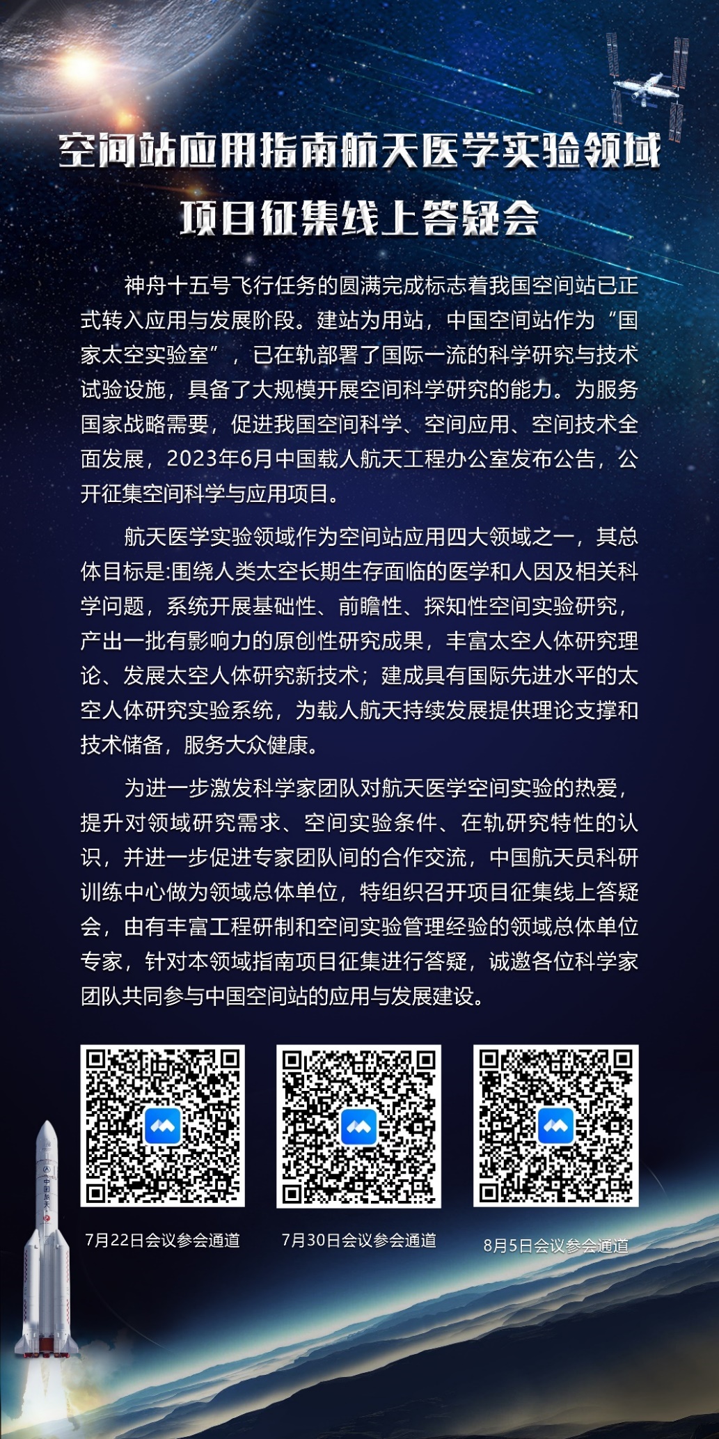 为保证本次空间科学与应用项目征集活动的顺利开展,后续中国航天员科研训练中心将继续召开项目征集线上答疑会,欢迎广大科研人员关注与参与。