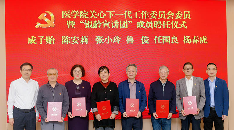 陈立明、夏标泉为成子贻、陈安莉、张小玲、鲁俊、任国良、杨春虎共6位老党员颁发学院关工委委员及“银龄”宣讲团聘书。
