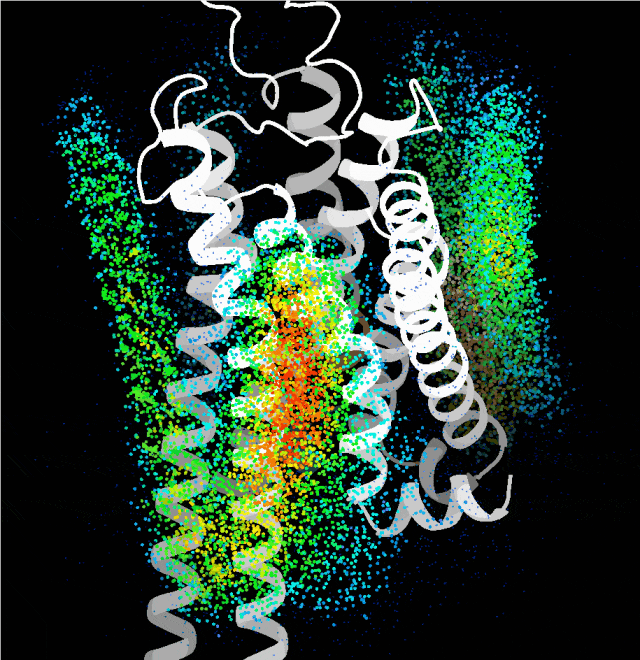 Point cloud plot revealing the most plausible regions for the transmembrane single helix to bind, generated by the probing algorithm.